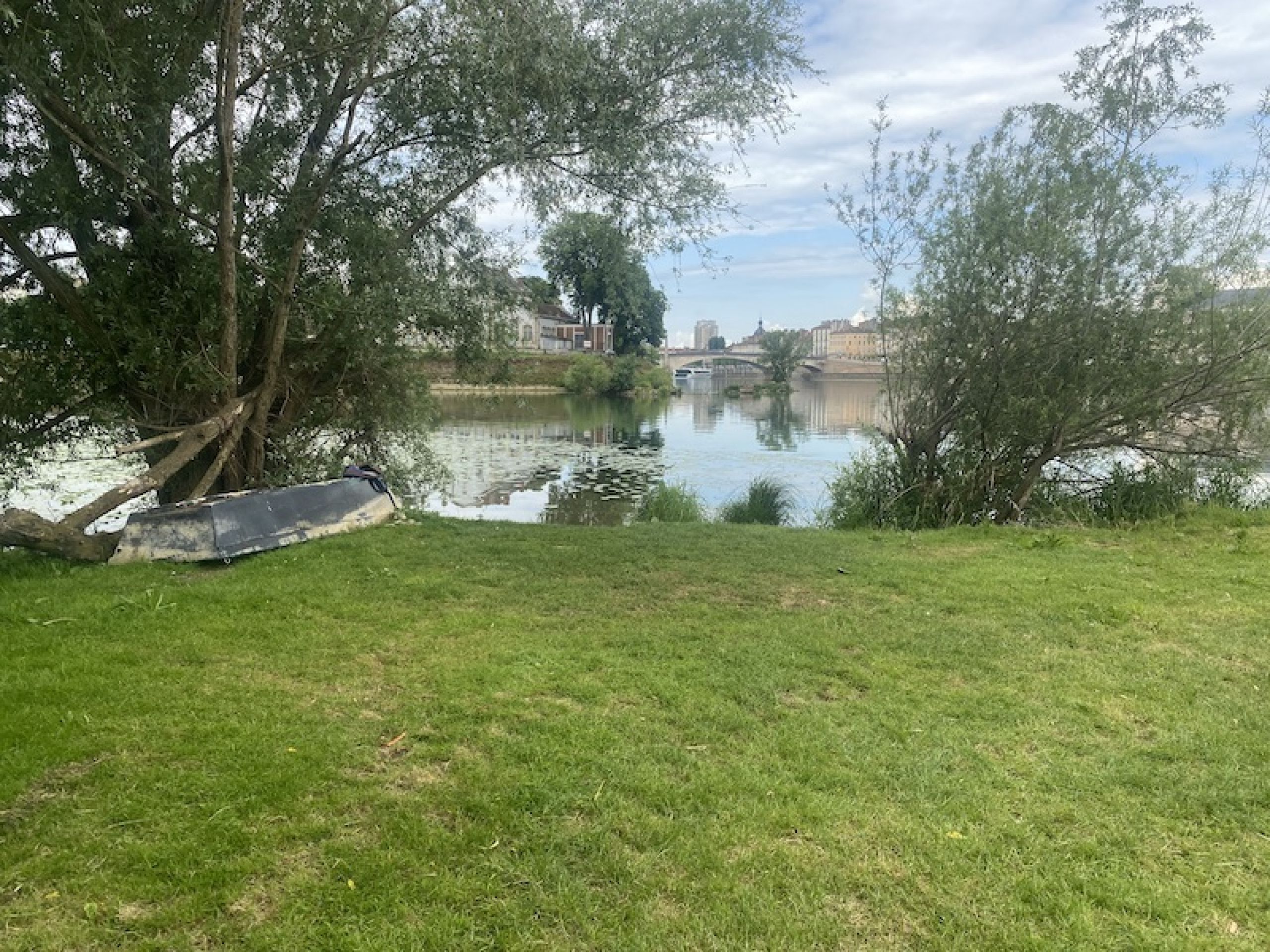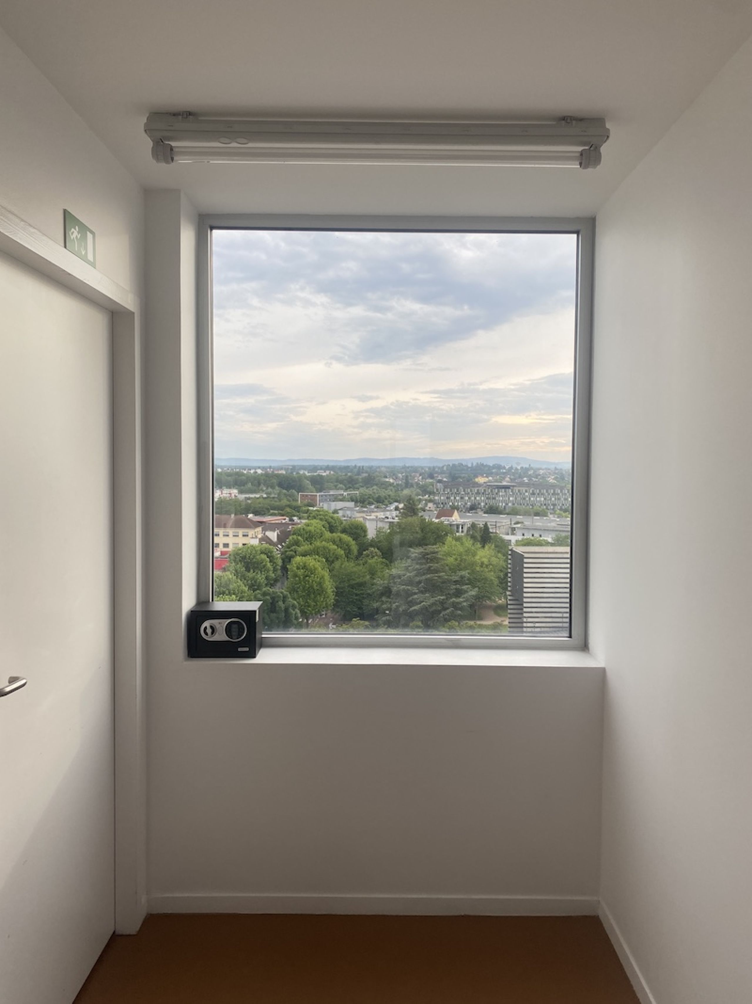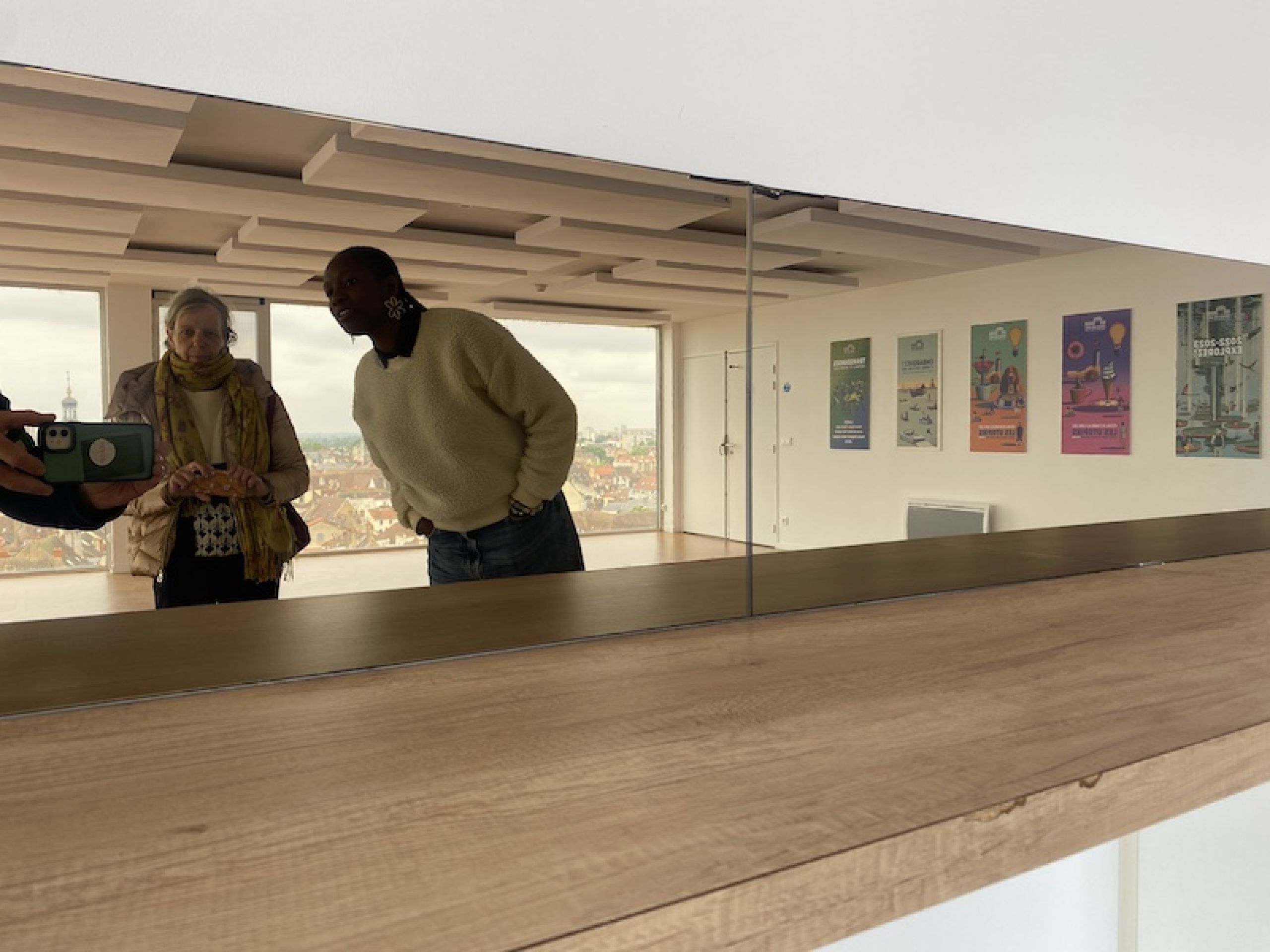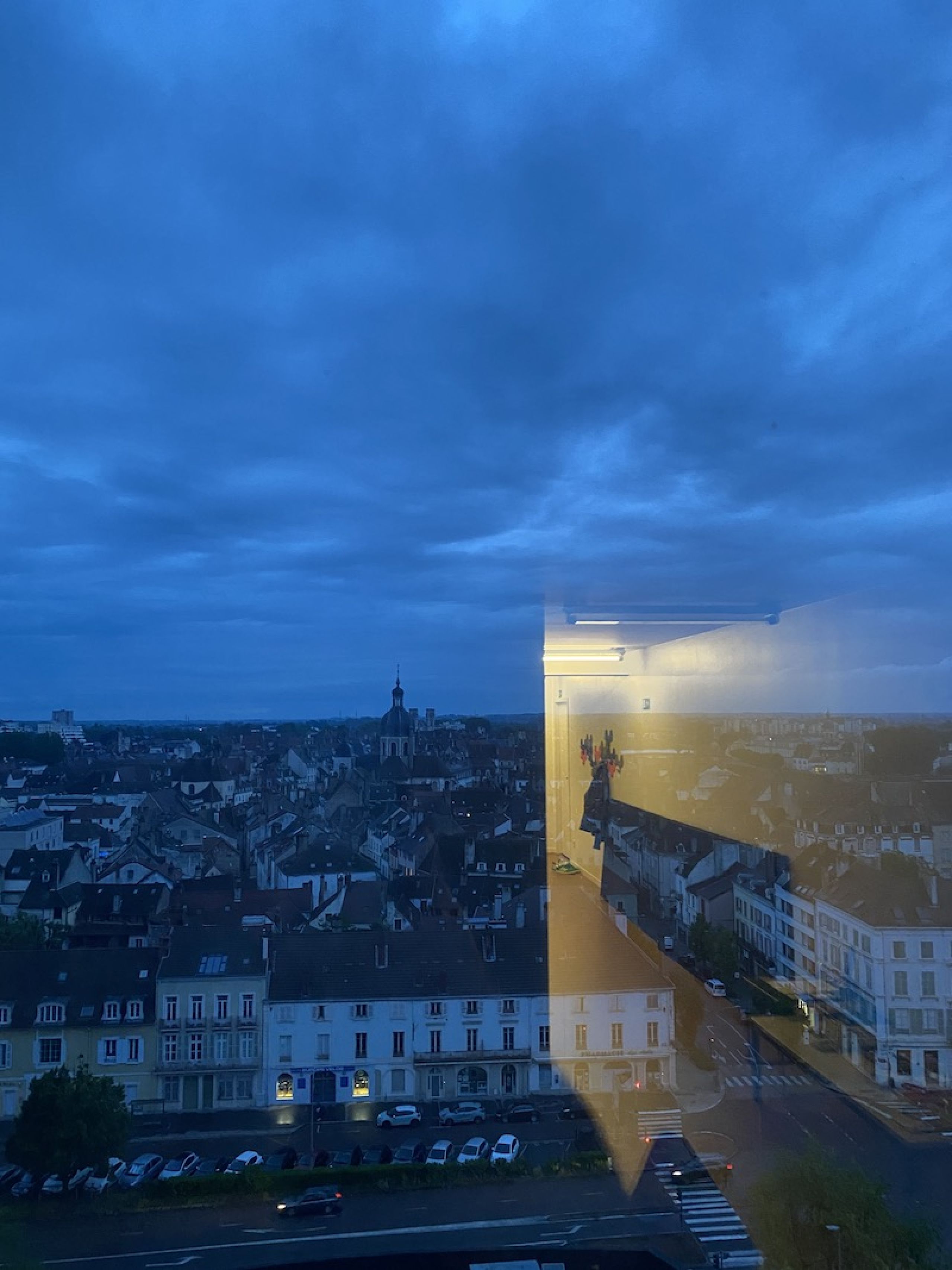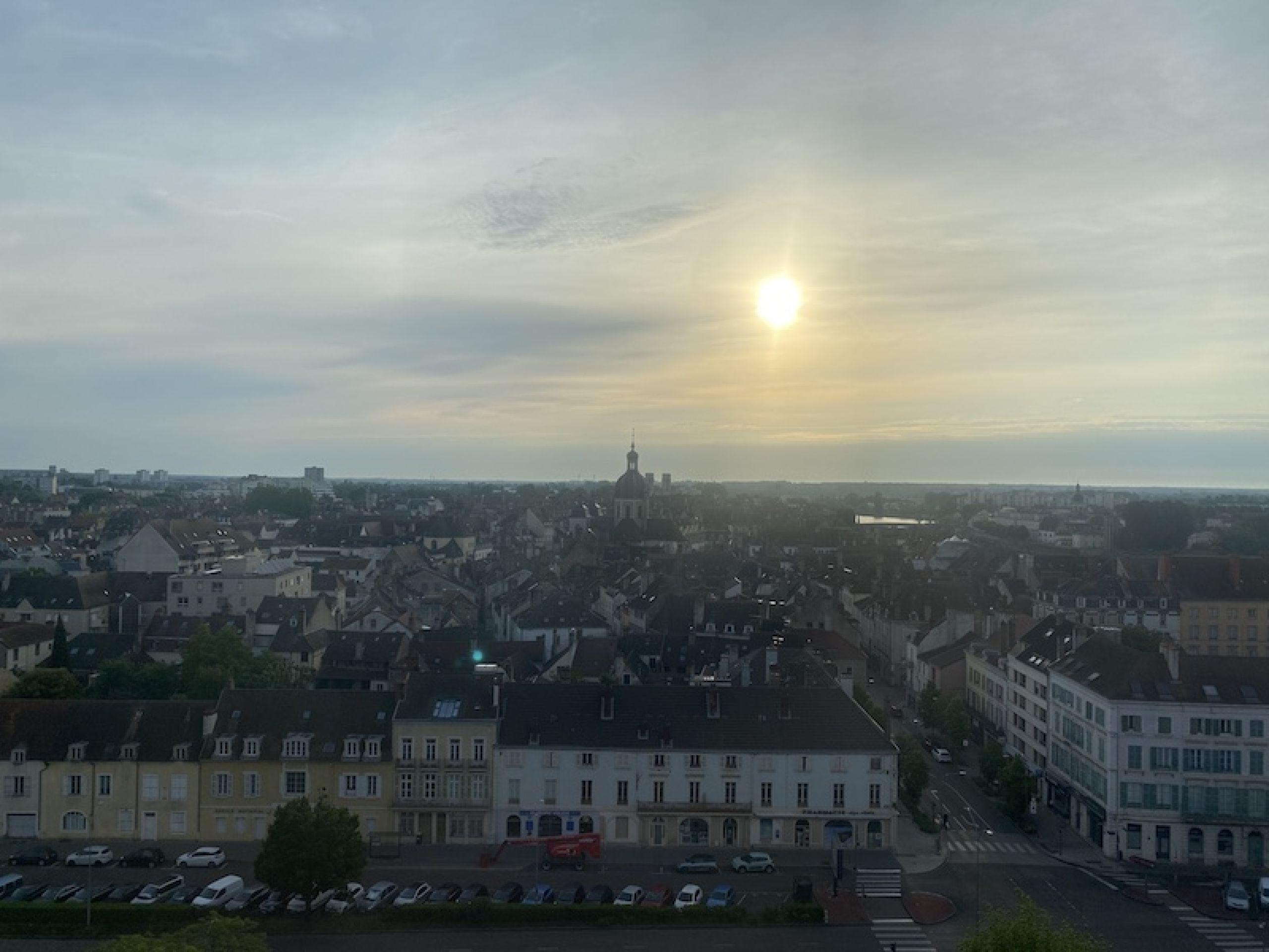 Elle m’emmène jusqu’à notre logement : un belvédère au-dessus du théâtre. Vue à 360° sur tout Chalon. Les grandes baies vitrées donnent le vertige.
