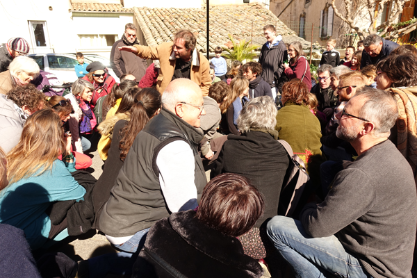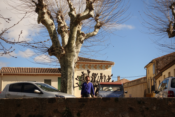 – Le parcours avec le choix du lieu pour l’installation du trépied. Ce n’est pas une mince affaire ! On a choisi la place de l’église, mais les bâtiments nous écrasent. Une place en cul-de-sac, mais la topographie nous paraît pauvre. Nous trouvons un espace en hauteur à la limite de la commune. Du voisinage aux fenêtres. Ca nous plaît. Il y a de la vie autour. Les parcours naissent à partir de ce point 0. Nous allons à la découverte de la zone des 50 mètres.
